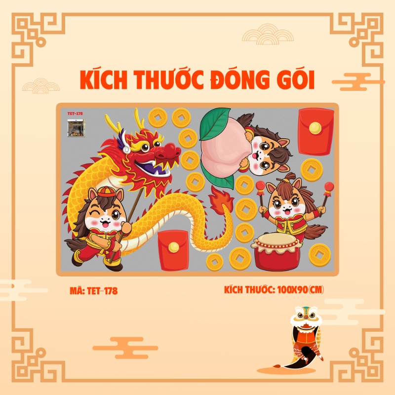Decal tết bé múa lân bên hoa đào