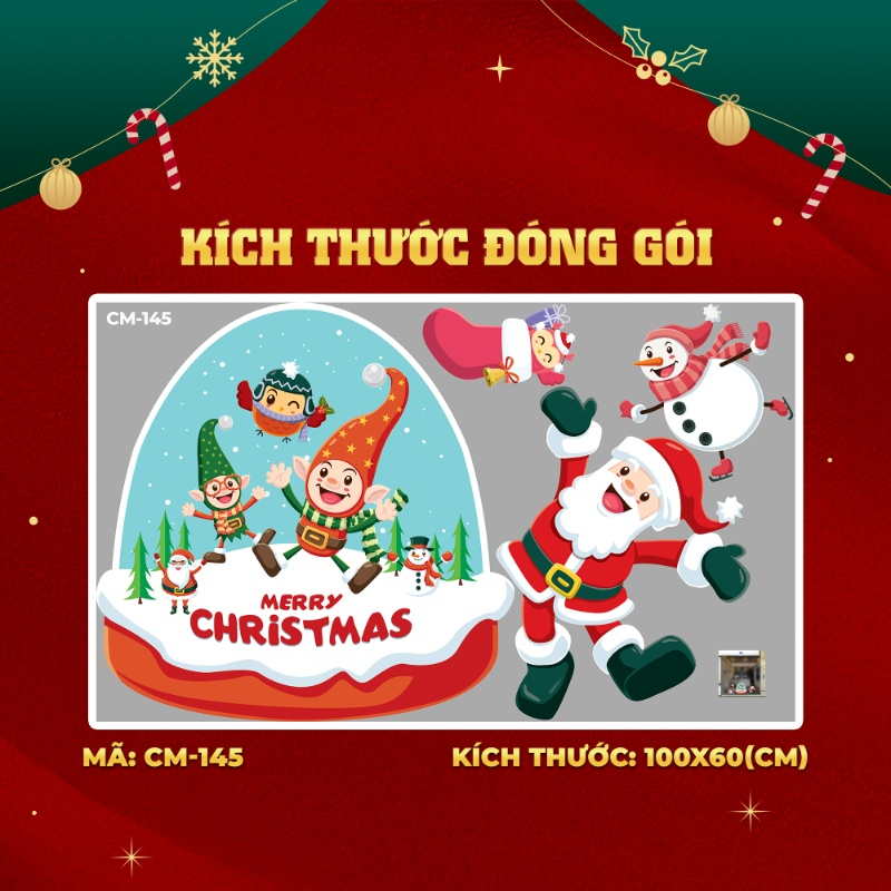 Decal noel ông già noel và tuần lộc chữ merry christmas trắng dán kính 2m