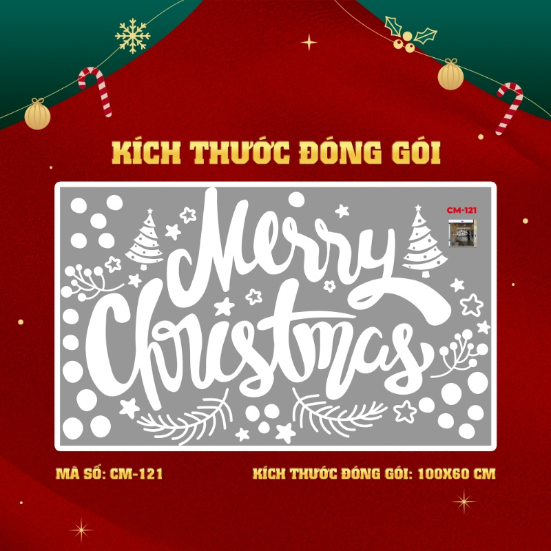 Decal noel chữ merry christmas đỏ và cây thông xanh dán kính 2m