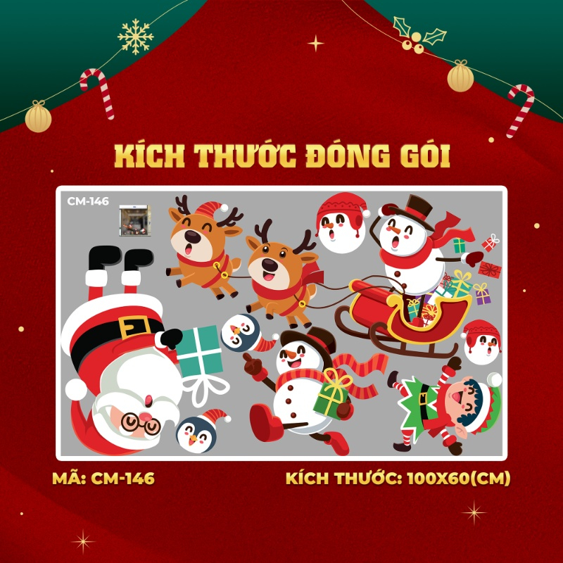 Decal ông giá noel và người tuyết bên quà giáng sinh dán kính 2m 3m