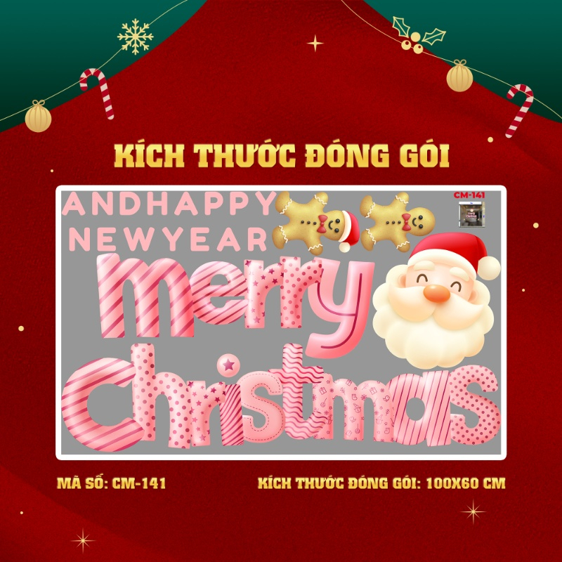 Decal noel chữ merry christmas bánh quy và ông già dán kính 2m