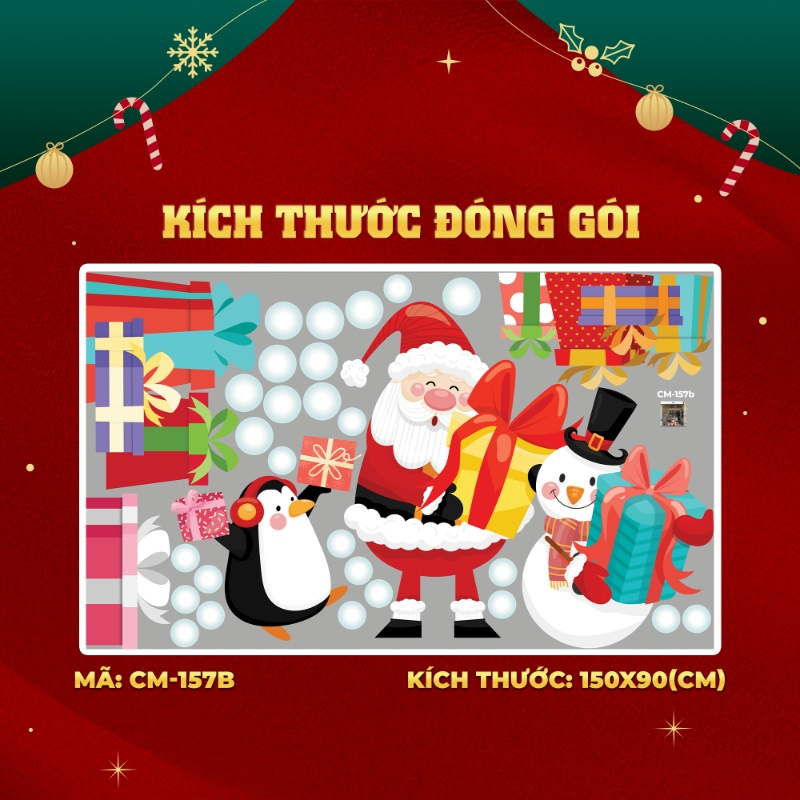 Decal noel ông già noel vui bên người tuyết và chim cánh cụt dán kính 2m