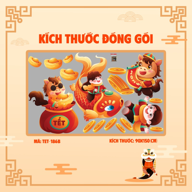 Decal tết bính ngọ 2026 thần tài múa rồng đón xuân cùng gia đình ngựa dán cửa kính chung cư